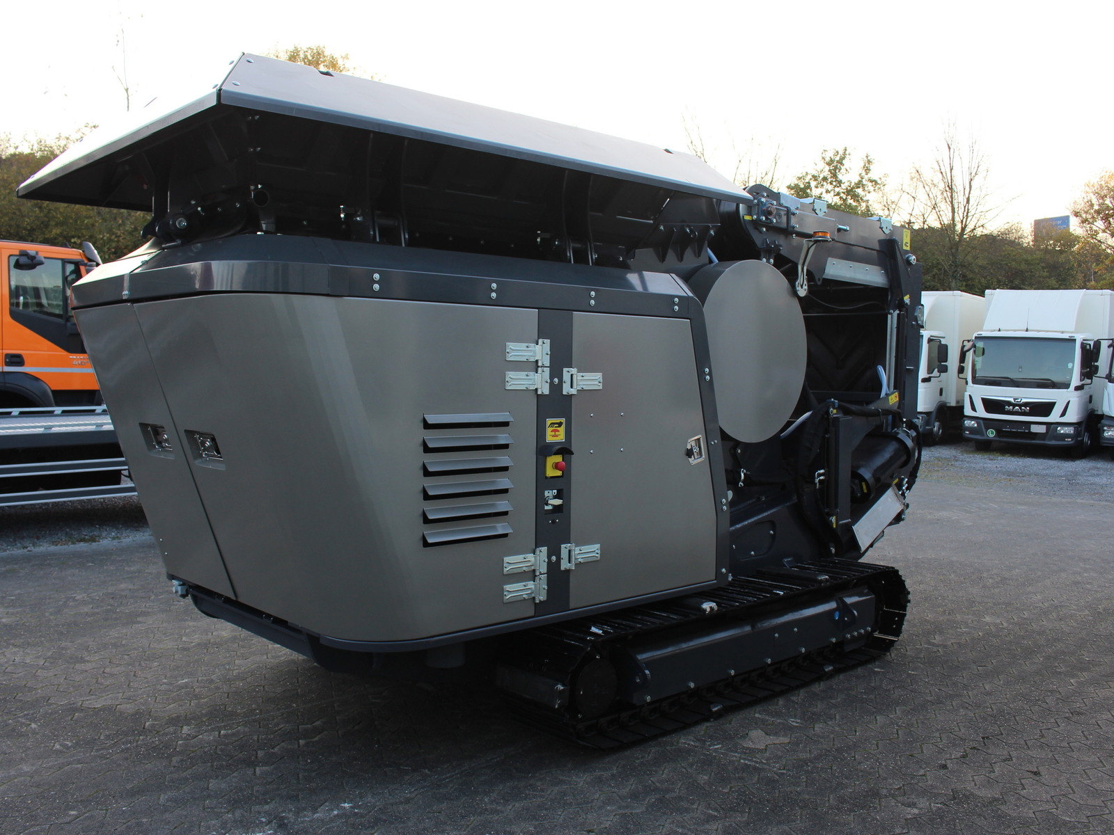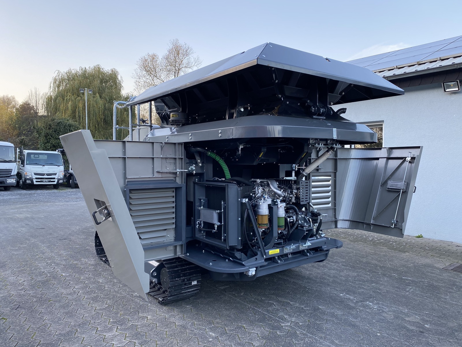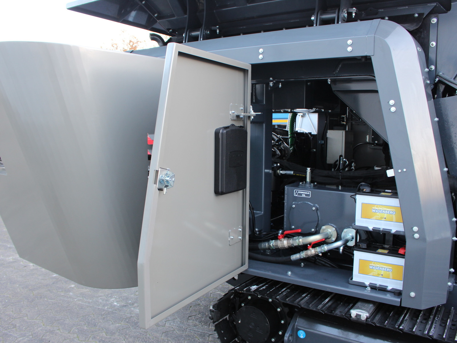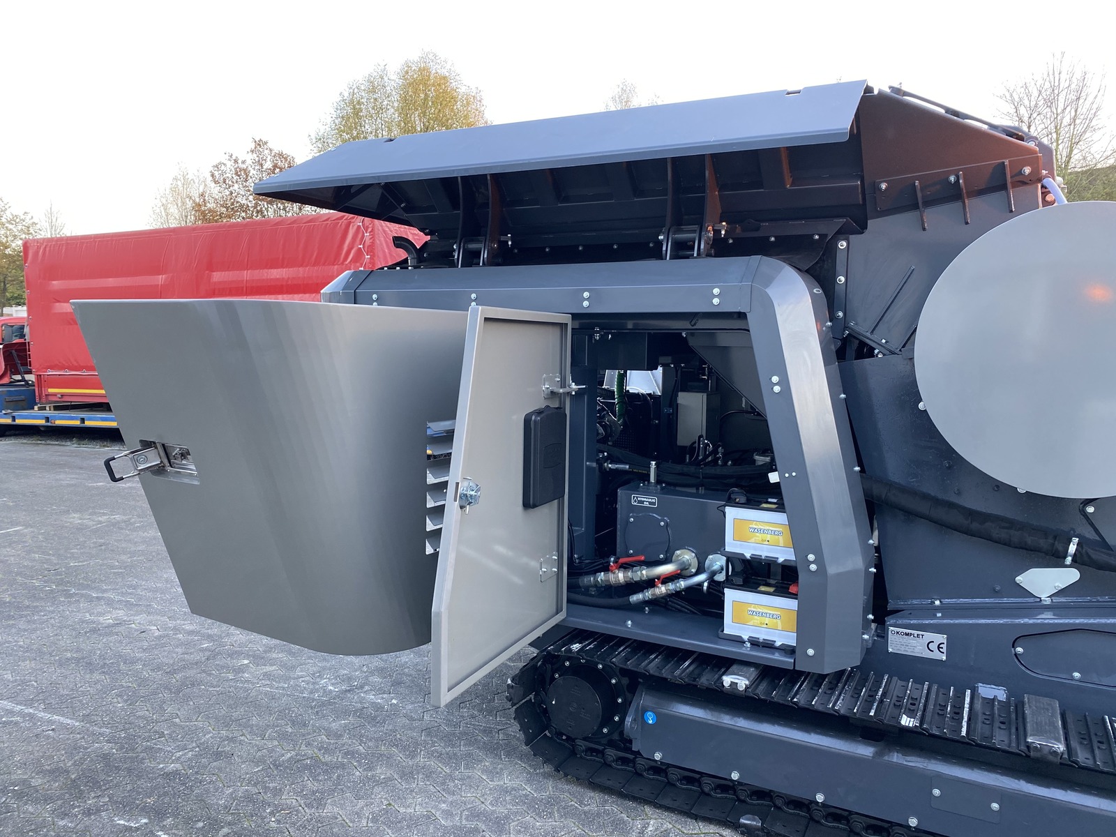 - Sehr guter Zugang zum Motor/Hydraulik etc. (Heckklappen und Seitenklappen öffnen sich um 90° und gewähren vollständigen Zugang für Wartungsarbeiten